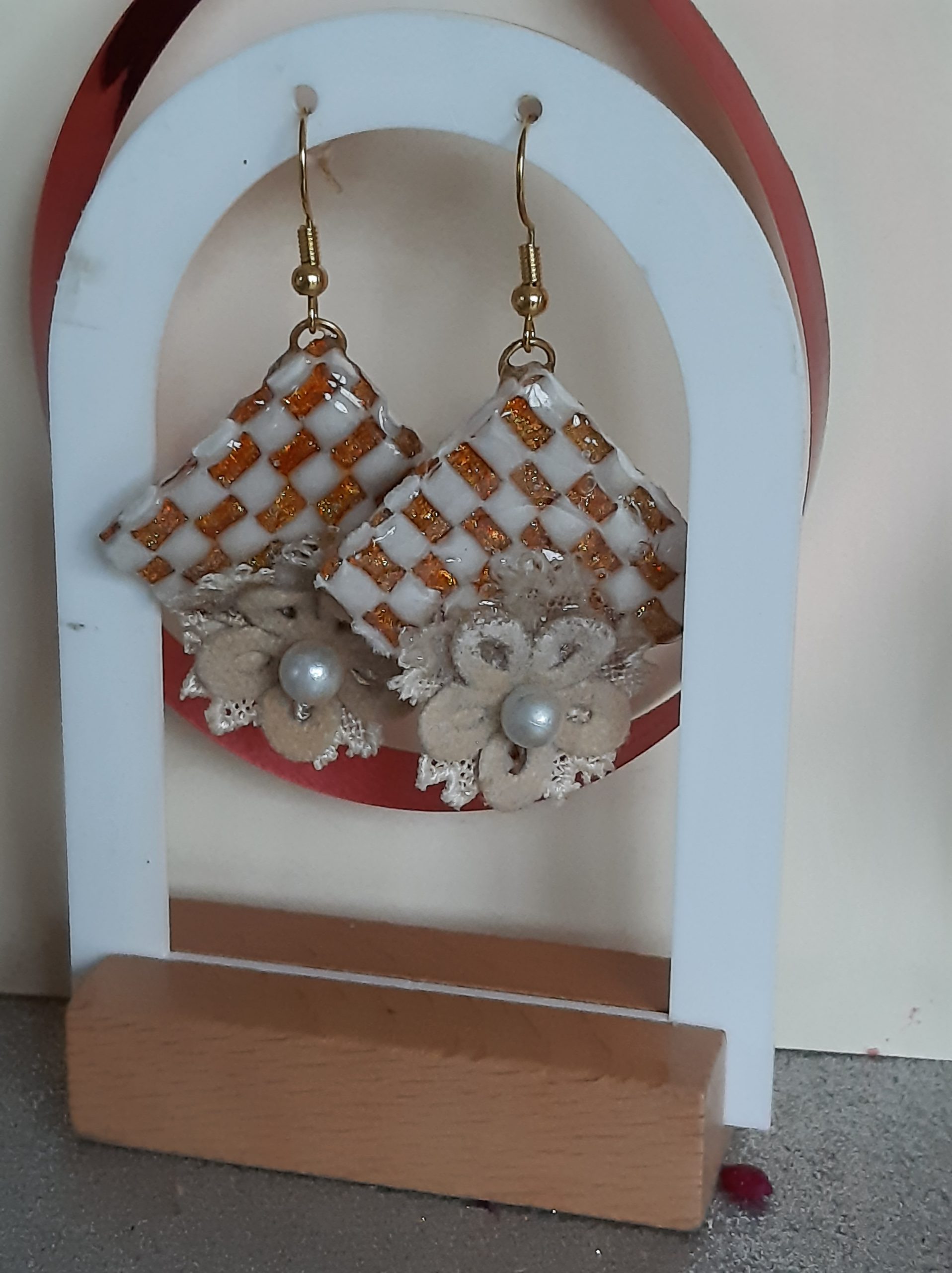 Losanges avec damier blanc à fond cannelle recouvert d’une couche de résine cristal d’où s’incruste une fleur en tissus beige ultra-douce d’où émerge une petite perle nacrée au cœur. 100% ambiance pain d’épice et chocolat chaud. Pas très légères, 100% Fait main et unique, crochets en acier inoxydable hypoallergénique. Le bijou qui sent bon Noël…