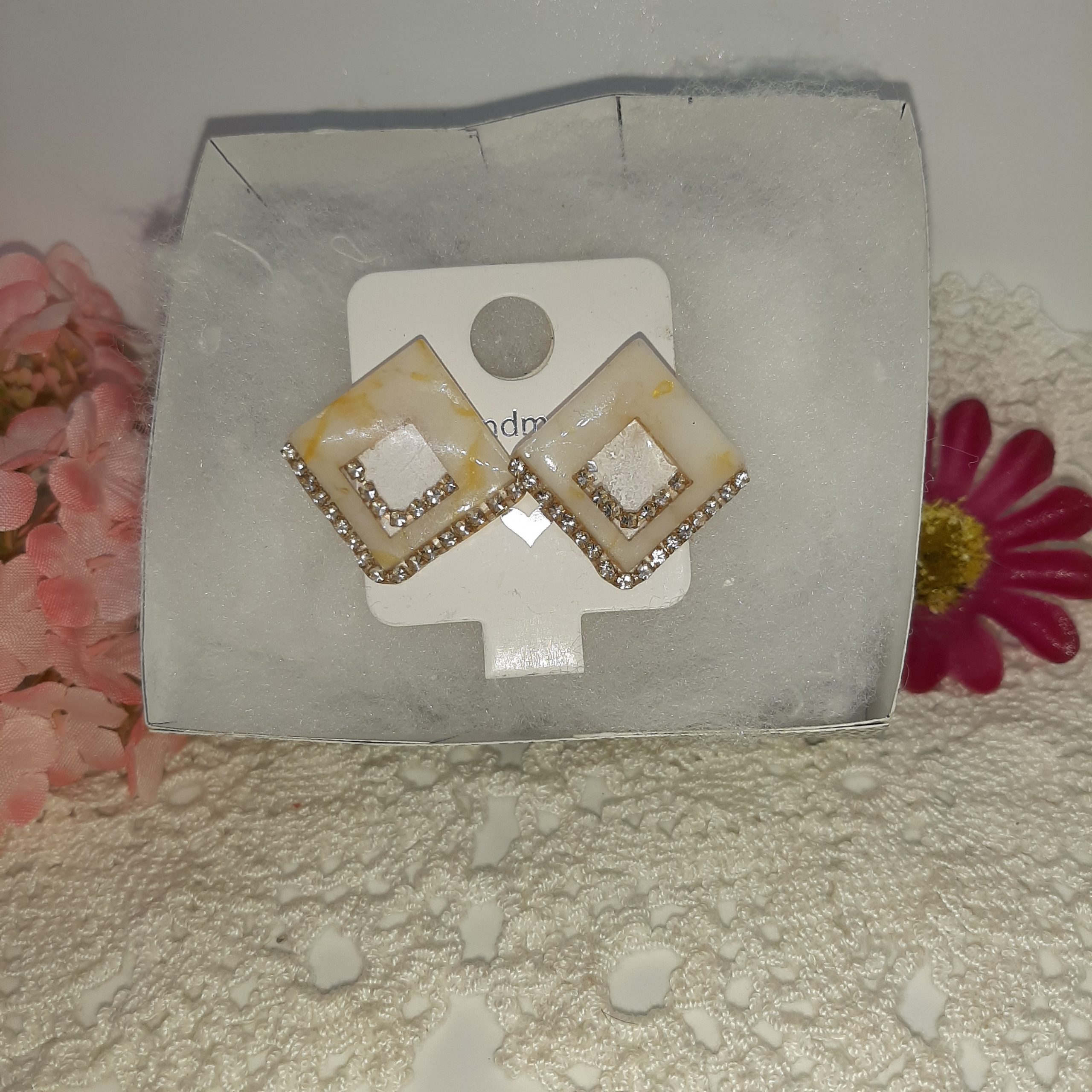 Description : Magnifiques boucles d’oreilles losanges en résine nacre ivoire/crème, bordées d’une fine ligne de paillettes dorées qui captent superbement la lumière. Design géométrique chic et intemporel, à la fois élégant et scintillant. Parfaites pour illuminer vos tenues quotidiennes ou de soirée.