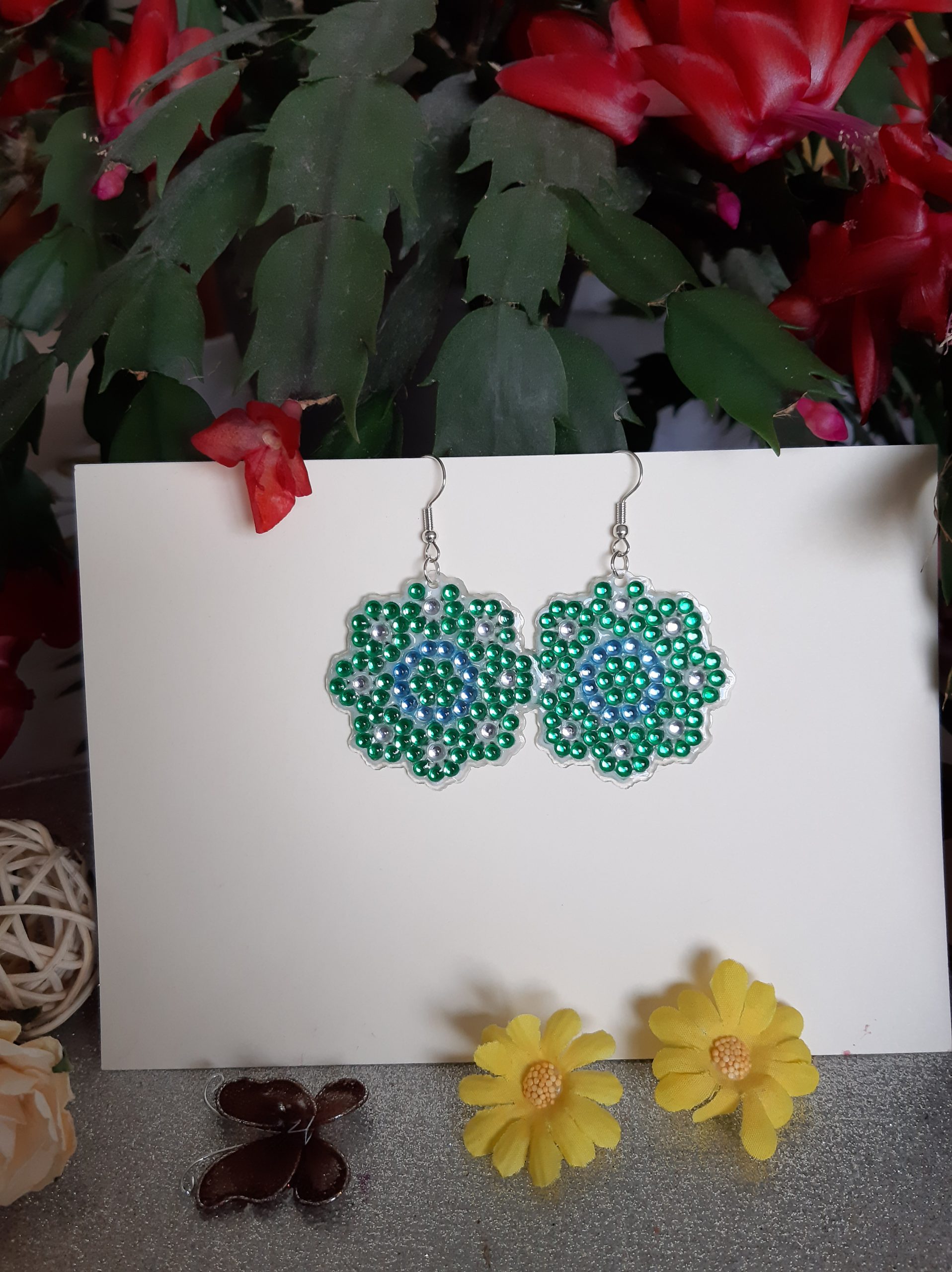 Somptueuses boucles d’oreilles en forme de fleur recouvertes sur une face de strass dégradés vert émeraude et bleu clair lumineux déposés un à un à la main. Un bijou qui évoque la luxuriance d’une forêt tropicale. Style glamour nature, chic tropical pour les amoureuses du vert et du bleu fleur diamètre 4 centimètres