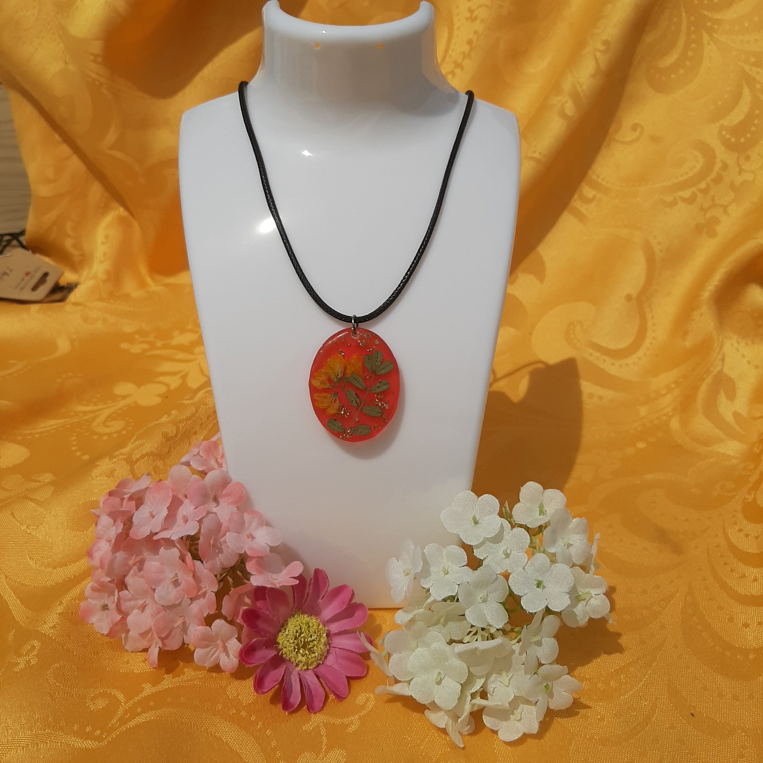 Pendentif ovale fleurs séchées orange flamboyant & feuille d’or et résine – Pièce unique artisanale