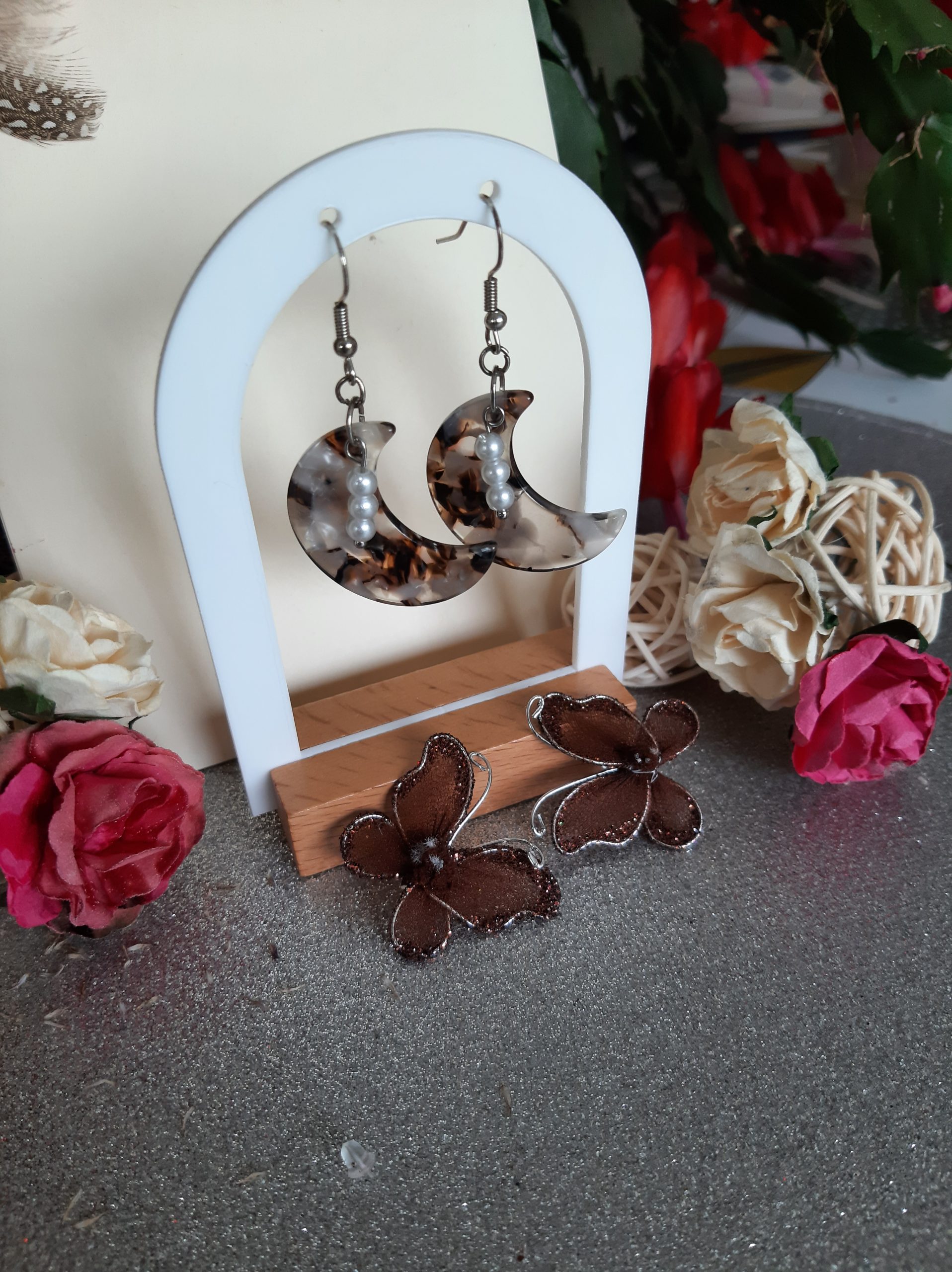 Croissant de lune ultra-chic en acétate écaille de tortue, blond beige et marron, sublimé par 3 perles nacrées qui danse doucement à chaque mouvement. Tendance rencontre la douceur bohème de la lune et de la perle qui apporte de la délicatesse. Bijou intemporel. Style Bohème chic, seventies revisitées, automne/hiver 25 S’accorde divinement bien avec carmel,…