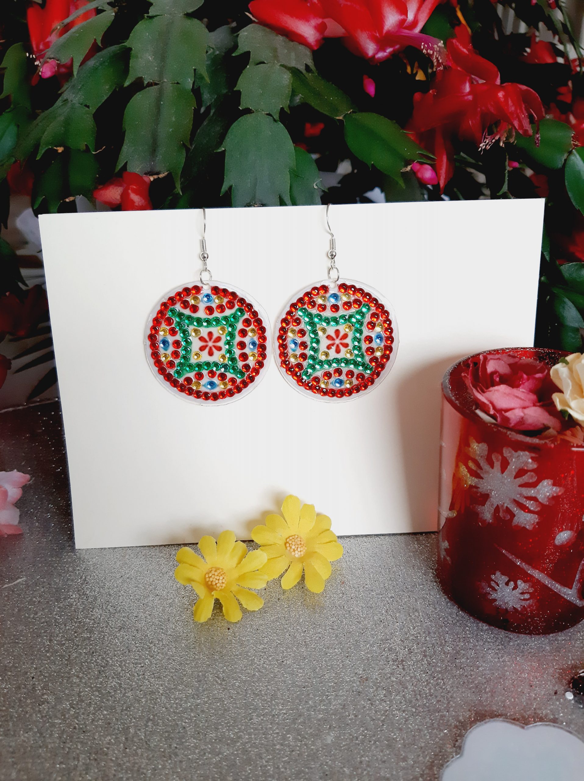 Élégant et intemporel. Mandala de Noël, ces superbes boucles pendantes et entièrement réalisées à la main, véritable bijou de fête le motif centrale en forme d’étoile ou de flocon est sublimé par des centaines de strass cristal rouge vif et vert sapin, doré et touche multicolores qui scintille à chaque mouvement. Un bijou joyeux et léger fait sensation au pied du sapin.