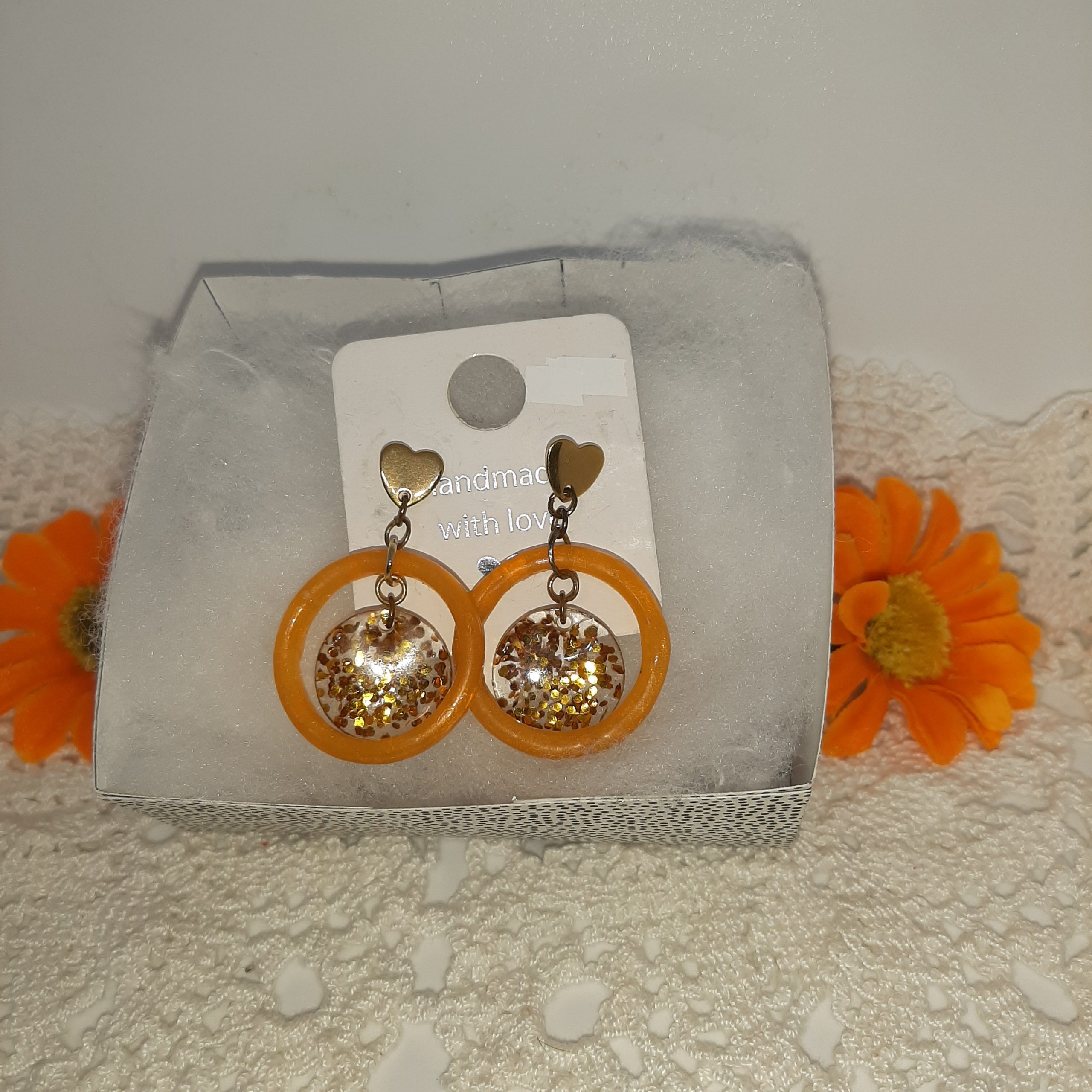 Boucles d’oreilles Œil de lumière scintillante Une touche d’été éternel et de lumière scintillante à vos oreilles ♡ Description complète : Magnifiques boucles d’oreilles pendantes entièrement réalisées à la main avec amour. Ces créations uniques mêlent une résine transparente scintillante remplie de paillettes dorées et cuivrées à un cercle en résine couleur orange brûlé intense,…